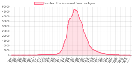 But laws require babies to be given names promptly. So after every birth, my parents needed to make a fast decision. In my case, after a long labor, they were both frazzled, and they chose the first thing that came to mind. As it happened, “Susan” reached an apogee in popularity that year, bestowed on 47,402 babies. That name came to mind first.