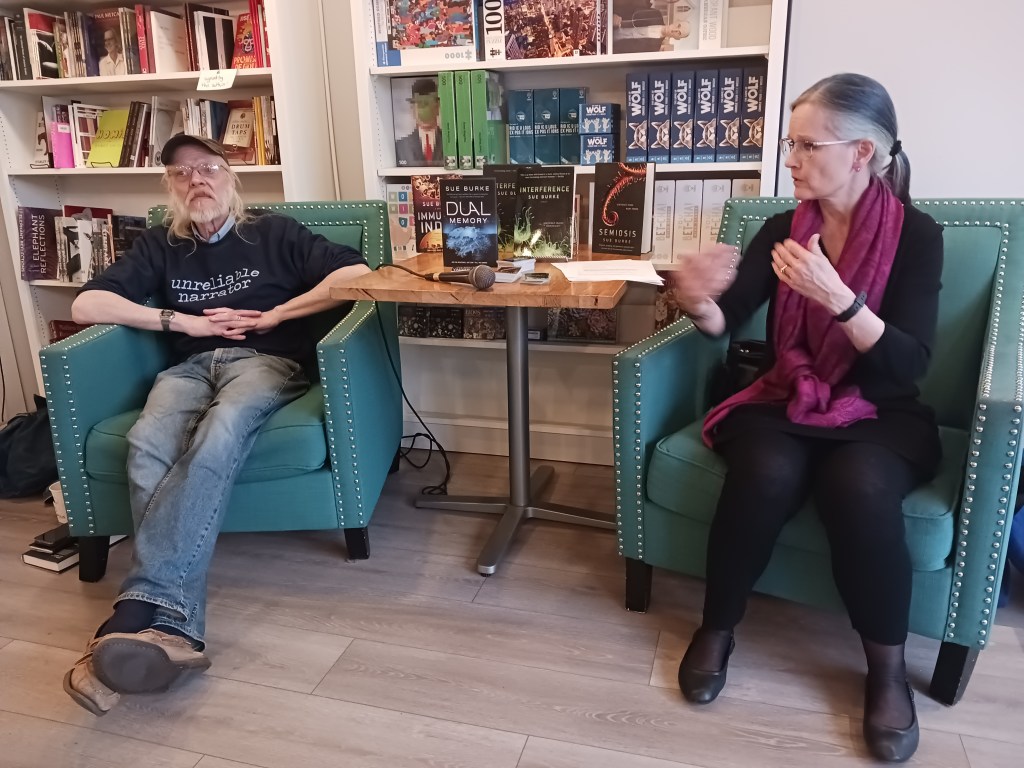 My new novel, Dual Memory, has now spent two weeks out in the wild world! Thank you to Volumes Bookcafé for hosting the launch, to Richard Chwedyk for leading a conversation with me at the launch, and to my husband, Jerry Finn, for all his support. And thanks to everyone who has bought it, and especially those who have reviewed it. Reader reviews at places like Amazon, Goodreads, and LibraryThing, and word of mouth, are the only sure way to sell books.